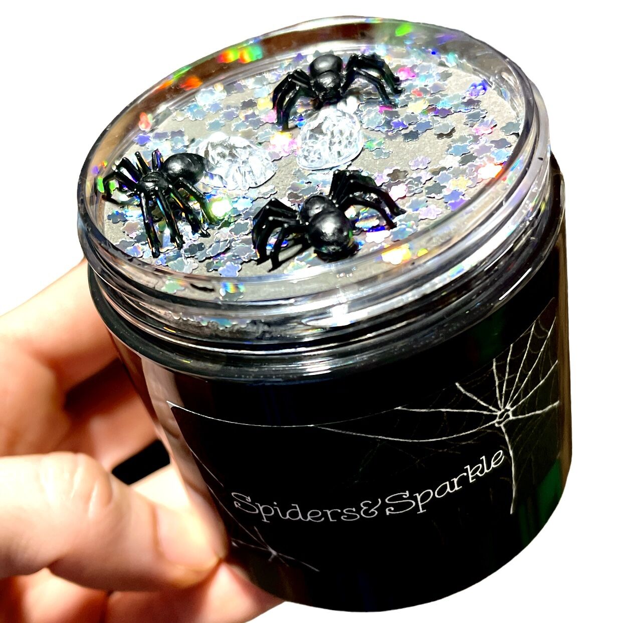 Black raspberry and vanilla scented. Thick glossy slime topped with grey clay and spider charms.